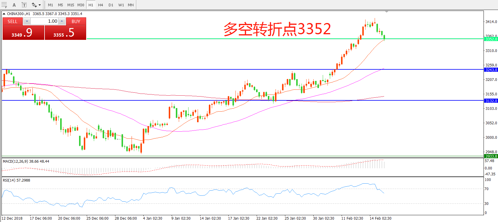 小时图看,CHINA300中华指数呈现冲高回落形态,与21均线3352出附近支撑,整体走势仍然呈现多头形态。均线系统呈现多头排列, MACD红柱缩短,RSI拐头向下,整体依然维持偏多思路。