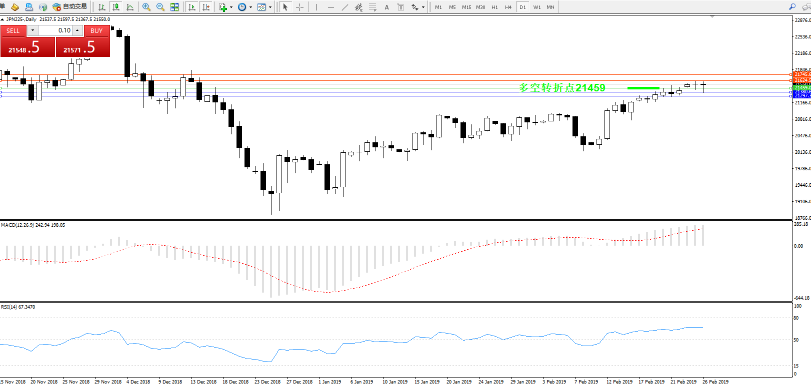 交易策略:21459上方看涨,目标21624、21745