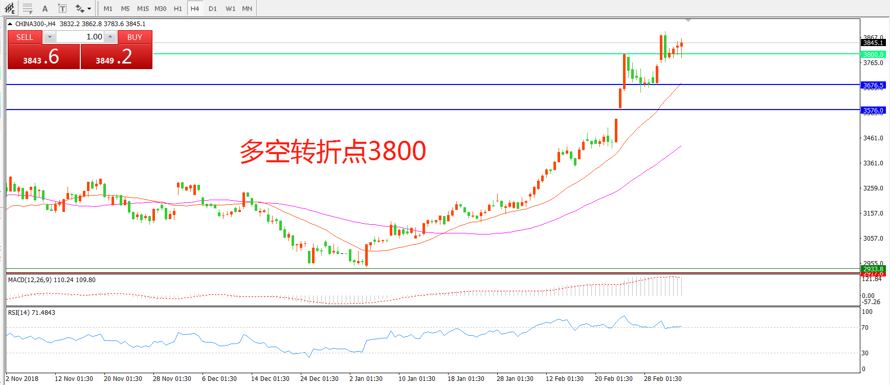4小时图看,CHINA300中华指数站稳3800后连续反弹,形态上多头趋势依然明显,均线系统呈多头排列, MACD红柱增加,整体思路逢低做多。