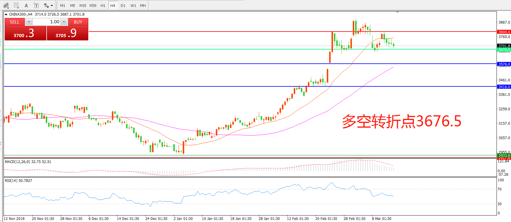 4小时图看,CHINA300中华指数近期持续回落,3 800附近遇阻后出现回落,但整体形态依然偏多,均线系统呈多头排列, MACD红柱缩减,日内宽幅震荡概率较大。