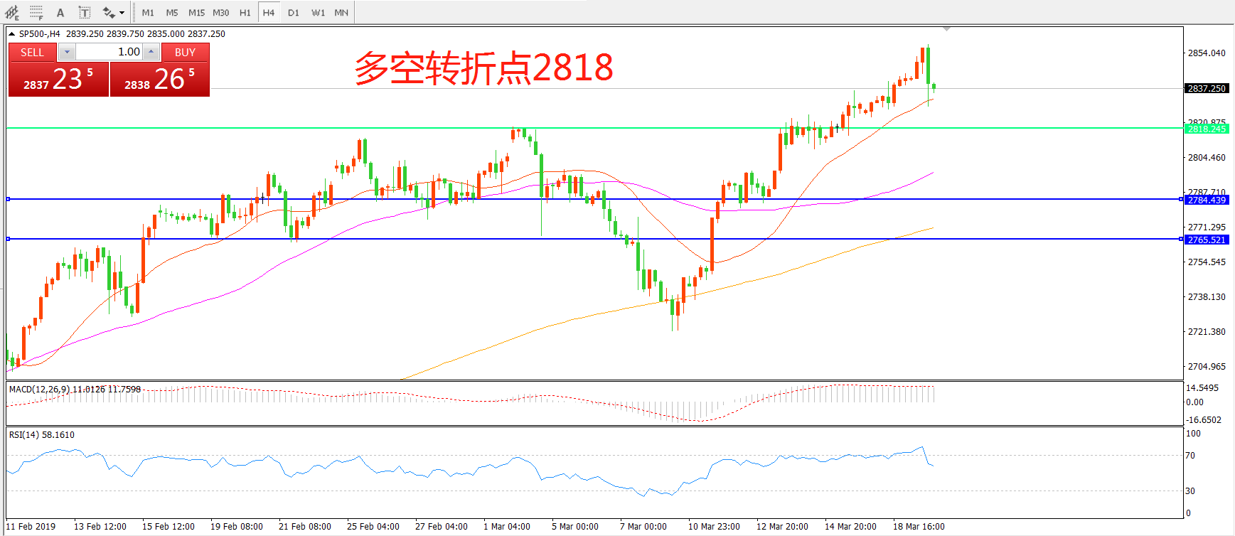 4小时图看,标普500在连续上行后出现大幅回落,目前暂时企稳于21均线附近。均线系统呈多头排列,MACD红柱走平,RSI指标掉头,日内震荡上行概率较大。