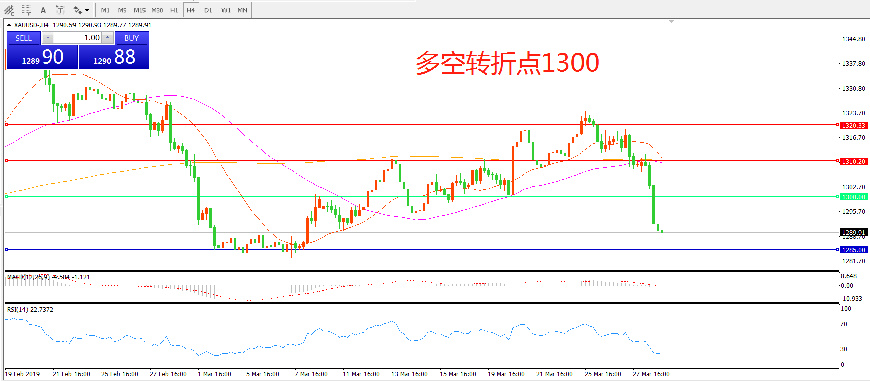 交易策略:在1300.00之下看跌,目标1285.00   1270.00