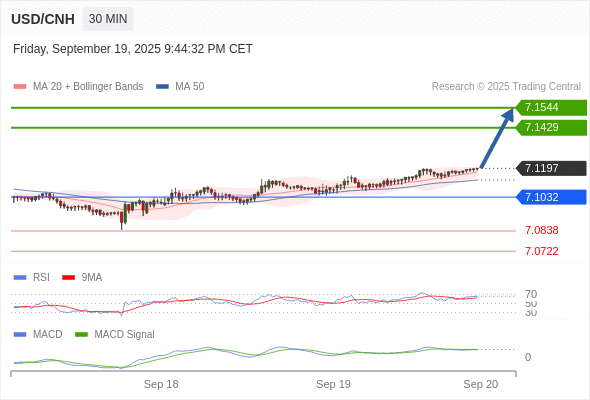 备选策略: 向下跌破 7.1032 ,将带来继续下跌的趋势,目标位为 7.0838 然后为 7.0722 。