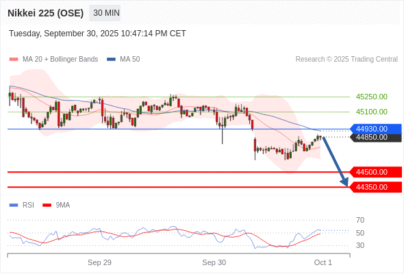 在 44930.00 之下,看跌,目标价位为 44500.00 ,然后为 44350.00 。