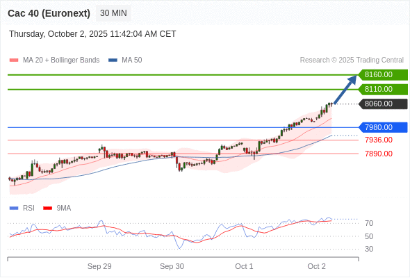 法国CAC指数期货 (Euronext) (V5) 当日内: 新一轮上升。