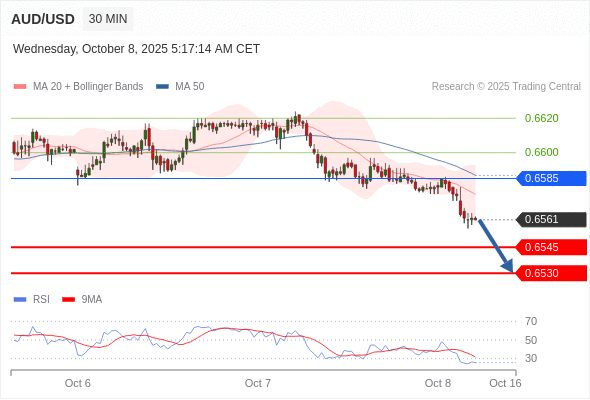 在 0.6585 之下,看跌,目标价位为 0.6545 ,然后为 0.6530 。
