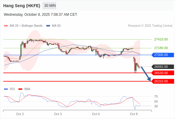 在 27000.00 之下,看跌,目标价位为 26530.00 ,然后为 26310.00 。