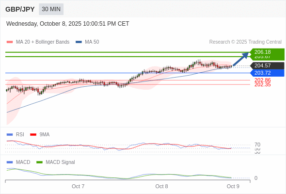 英镑/日元 当日内: 看涨,当 203.72 为支撑位,目标定在206.18。