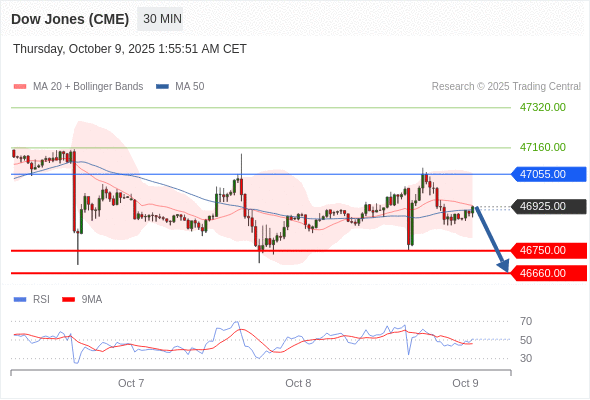 在 47055.00 之下,看跌,目标价位为 46750.00 ,然后为 46660.00 。