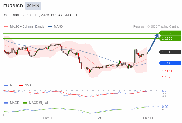 欧元/美元 当日内 : 看涨,当 1.1579 为支撑位。