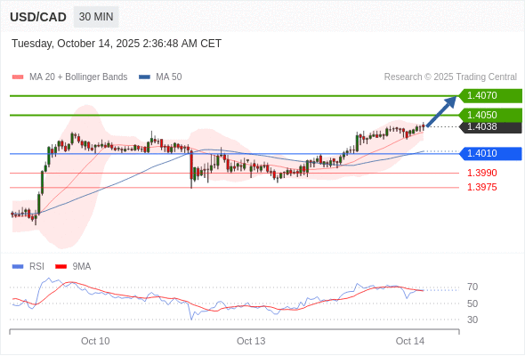 在 1.4010 之上,看涨,目标价位为 1.4050 ,然后为 1.4070 。
