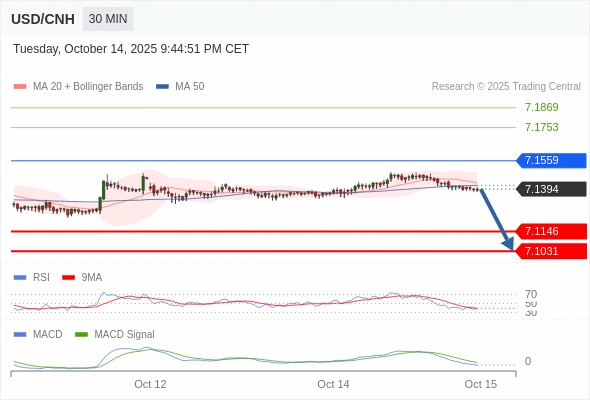 美元/人民币 当日内: 看跌,在 7.1559 之下。