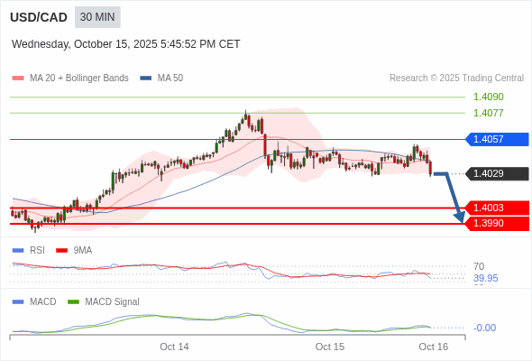 美元/加元 当日内 : 看跌,在 1.4057 之下。
