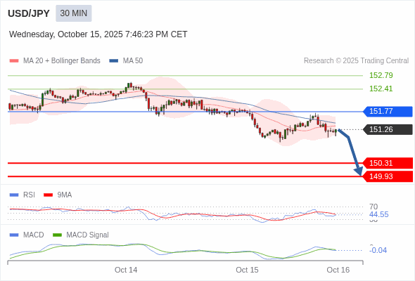 美元/日元 当日内 : 看跌,在 151.77 之下。