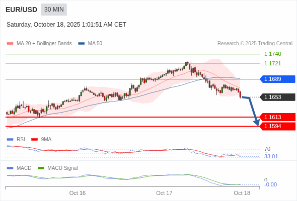 欧元/美元 当日内 : 看跌,在 1.1689 之下。