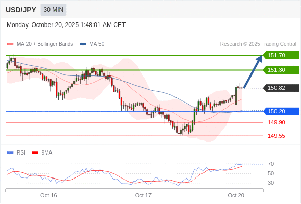 在 150.20 之上,看涨,目标价位为 151.30 ,然后为 151.70 。