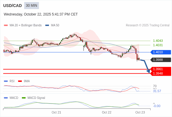 美元/加元 当日内 : 看跌,在 1.4010 之下。