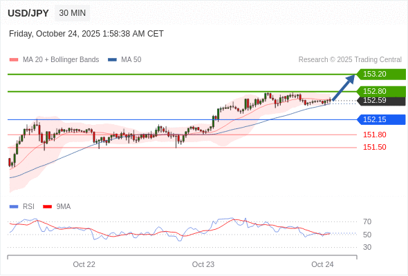 在 152.15 之上,看涨,目标价位为 152.80 ,然后为 153.20 。