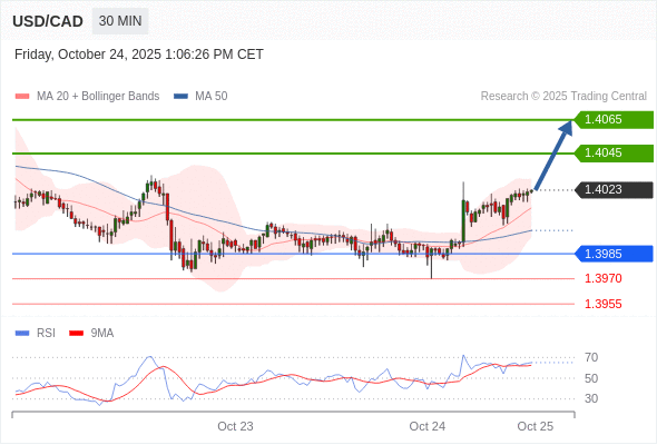 在 1.3985 之上,看涨,目标价位为 1.4045 ,然后为 1.4065 。