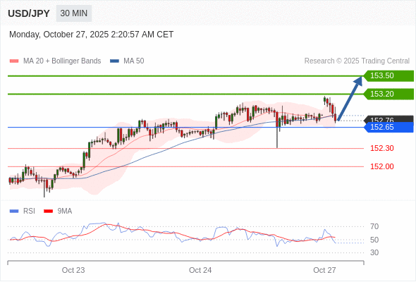 在 152.65 之上,看涨,目标价位为 153.20 ,然后为 153.50 。