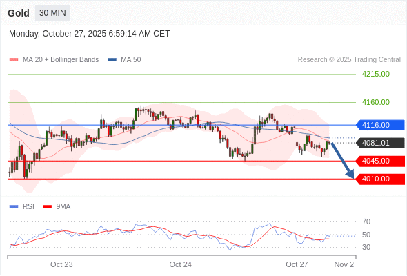 交易策略: 在 4116.00 之下,看跌,目标价位为 4045.00 ,然后为 4010.00 。