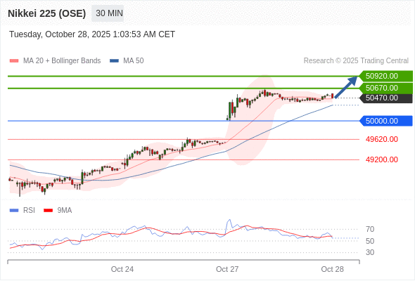 日经225股指期货 (OSE) 当日内: 在50000.00之上,看涨。