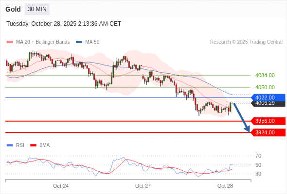 在 4022.00 之下,看跌,目标价位为 3956.00 ,然后为 3924.00 。