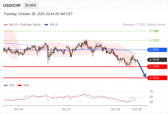 在 0.7955 之下,看跌,目标价位为 0.7928 ,然后为 0.7910 。