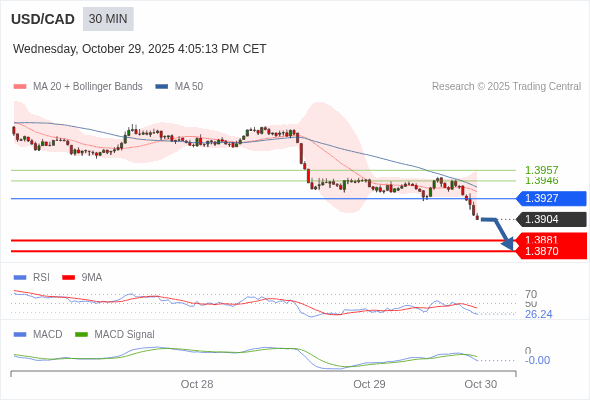 技术点评: RSI技术指标小于30。在这种情况下,说明有很强的下跌趋势,或者意味着处在超卖的状态下,可能会有向上的反弹。我们将观察RSI技术指标是否出现背离现象。 MACD技术指标处在其信号线之下看空。 配置为负。 此外,价位低于其20天及50天移动平均线 ( 分别位于1.3934 和1.3939 )。 最后,价位跌破其布林线通道下轨 (位于1.3910。