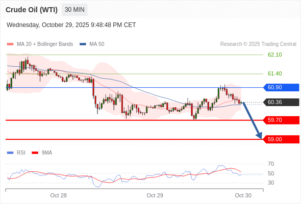在 60.90 之下,看跌,目标价位为 59.70 ,然后为 59.00 。