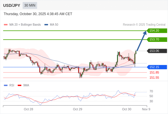 在 152.15 之上,看涨,目标价位为 153.70 ,然后为 154.20 。