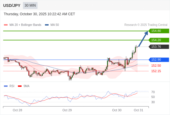 在 152.90 之上,看涨,目标价位为 154.20 ,然后为 154.80 。