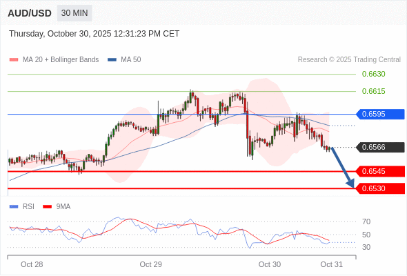在 0.6595 之下,看跌,目标价位为 0.6545 ,然后为 0.6530 。