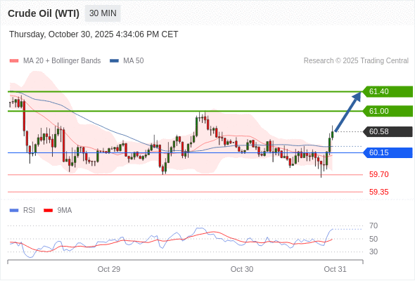 在 60.15 之上,看涨,目标价位为 61.00 ,然后为 61.40 。