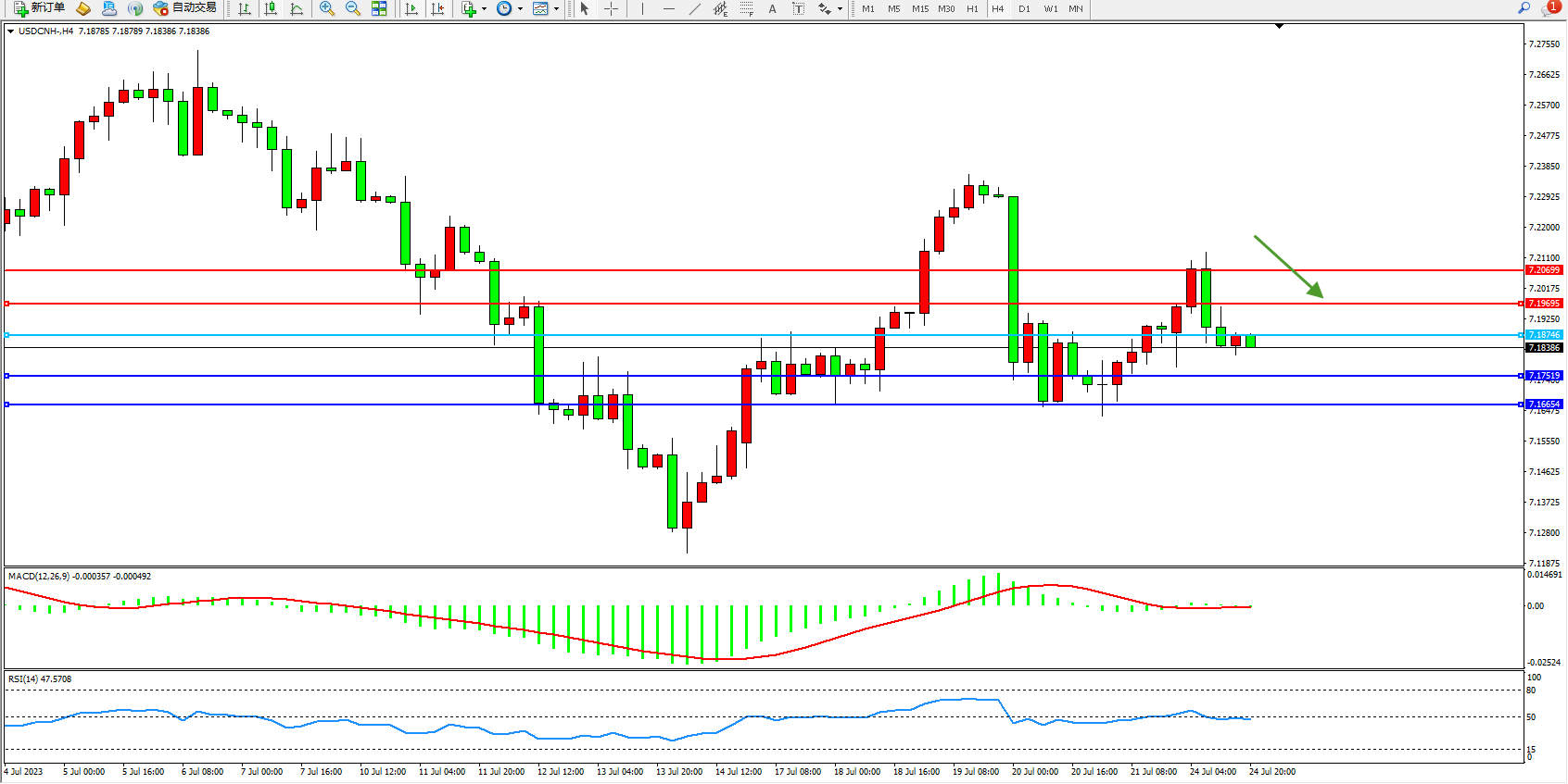 美元人民币USDCNH——4小时K线图显示: