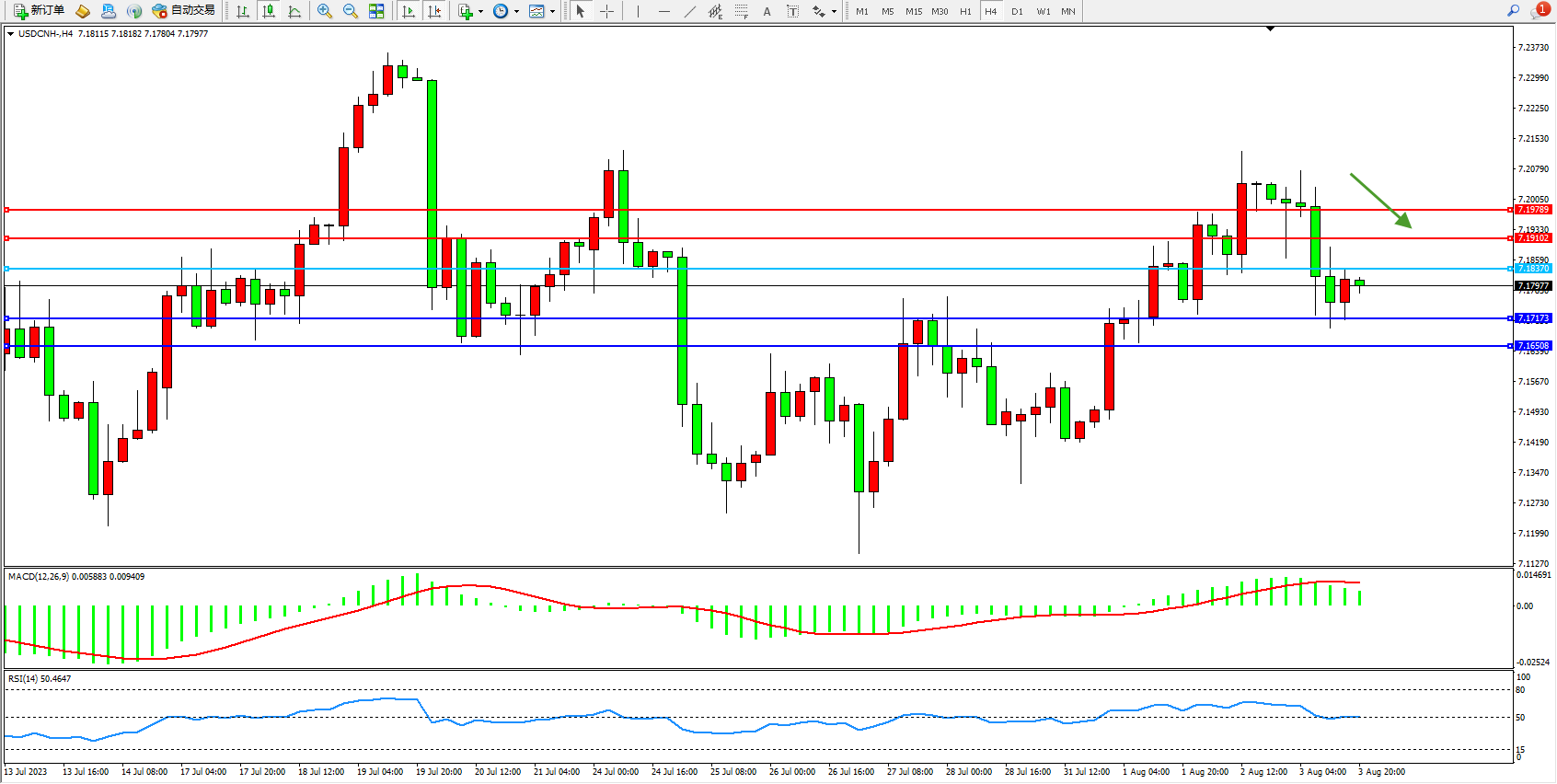 美元人民币USDCNH——4小时K线图显示: