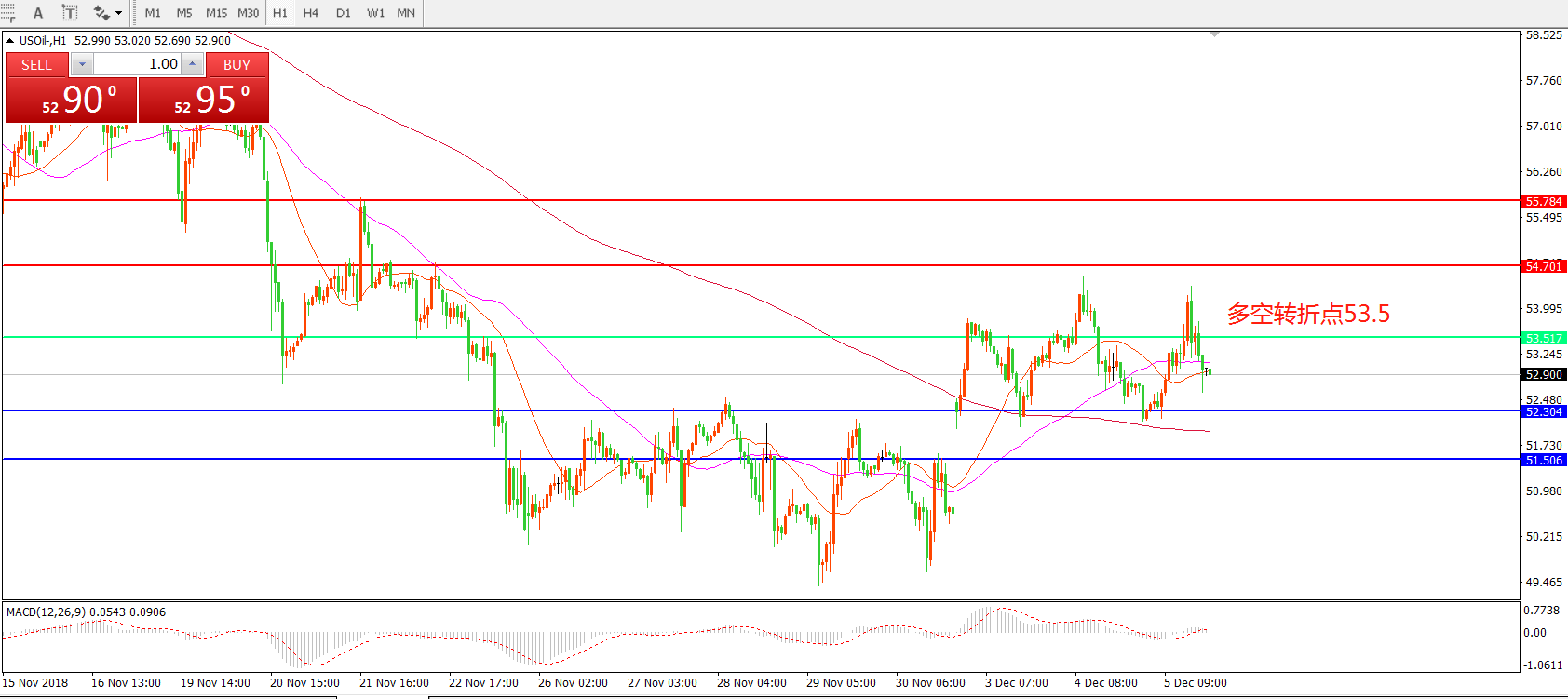 小时图看,油价跳空高后出现回落,形态上有形成箱体震荡的概率较大,短期均线走平,MACD红柱缩短,短期关注下方支撑52.3一线。