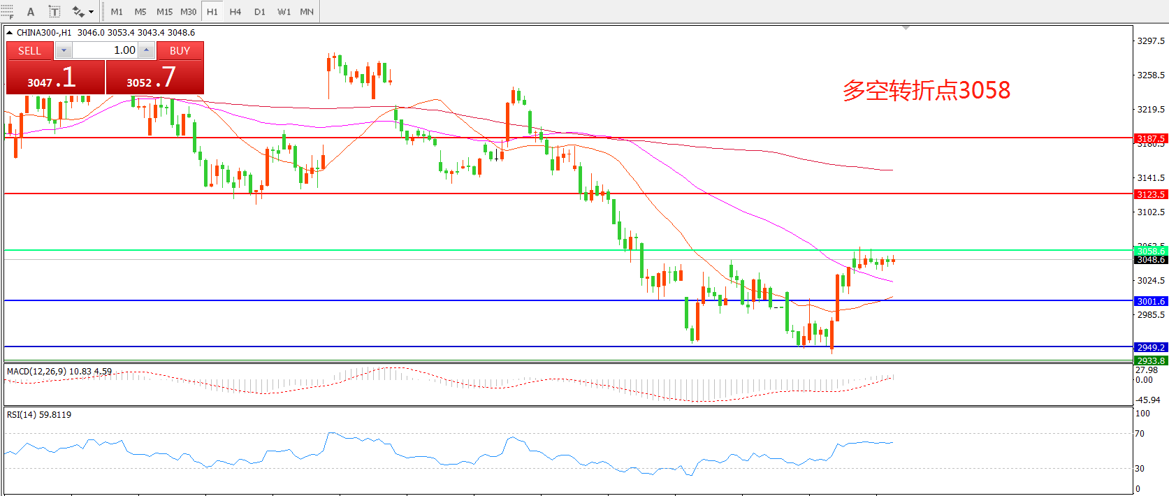 1小时图看,CHINA300中华指数收复3000整继续上行,但整体仍在3058多空转折点之下,均线系统走平, MACD绿柱缩短,短线震荡整理概率较大。