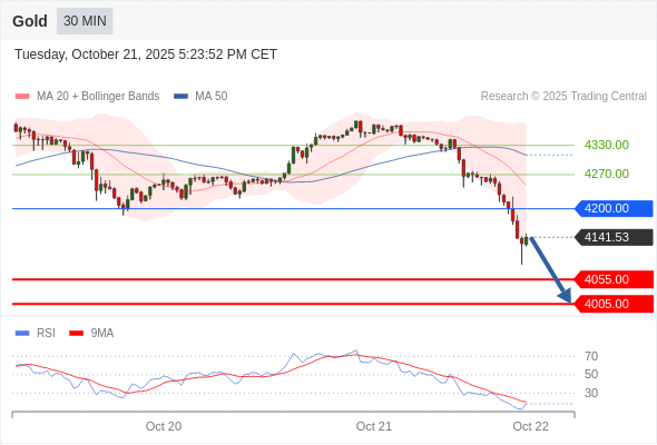 在 4200.00 之下,看跌,目标价位为 4055.00 ,然后为 4005.00 。