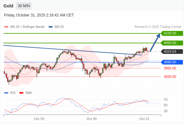 在 3980.00 之上,看涨,目标价位为 4060.00 ,然后为 4100.00 。