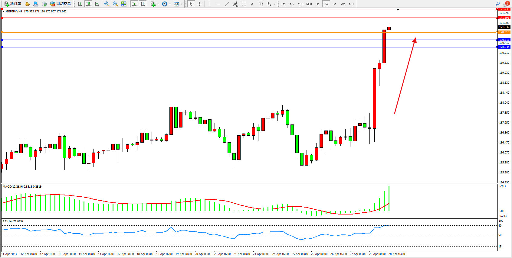 4小时图看:多头动力强势拉升上扬,短期看涨情绪依旧,市场多头动力未见有止步迹象,MACD指标处于多头区域强势上扬,RSI指标处于多头区域超买区80均衡线附近整理;