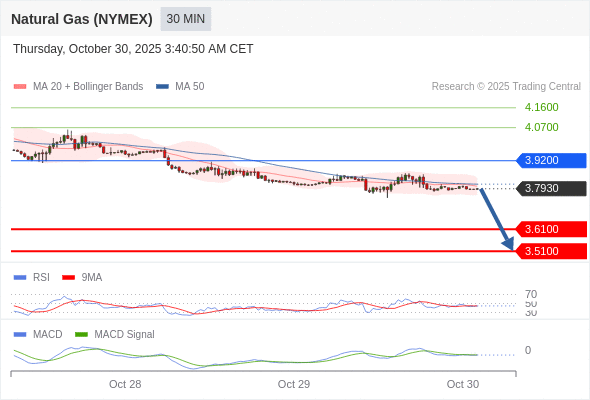 Natural Gas (NYMEX) (DEC5) 当日内: 看跌,在 3.9200 之下。